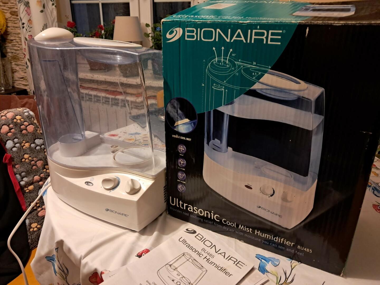 Sprzedam ultradźwiękowy nawilżacz powietrza BIONAIRE, model BU485 widoczny na zdjęciach, nieduży, kompaktowy, stan bardzo dobry, prawie nieużywany, oryginalnie opakowany, w komplecie instrukcja, karta gwarancyjna, dostarcza do 7.6 litra chłodnej wilgoci na dobę, dwie prędkości nawilżania z regulacją natężenia "mgiełki", nawilża skutecznie pomieszczenia do 50 m2, układ oczyszczania usuwa nieczystości, posiada wymienny wkład filtrujący, możliwość dodania olejków zapachowych do wody, bardzo cicha praca idealne do pokoi dziecięcych, salonów i biura.